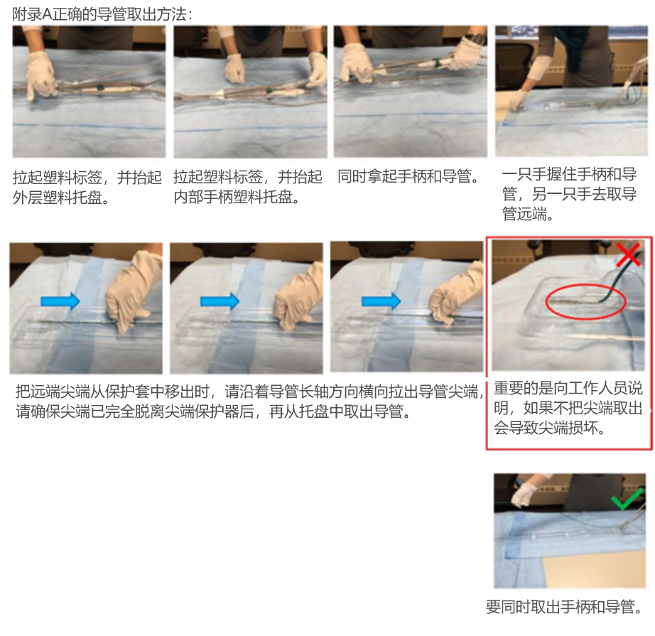 查看附录A中的指南(如下图所示),了解从包装托盘中正确取出TactiFlex消融导管的方法,确保在使用前认真检查电极和导管尖端的完整性和整体状况。为避免损坏导管尖端,请确保远端尖端已完全脱离尖端保护器后,再将远端尖端从托盘中取出。