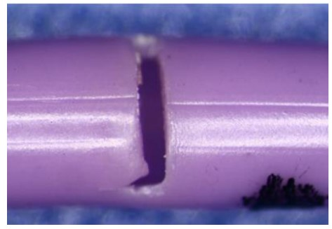 Power PICC中心静脉导管适用于经外周静脉进入中心静脉系统,进行静脉输注或治疗、造影剂高压注射及中心静脉压监测,可短期或长期使用。Bard发现部分导管因材料疲劳导致的泄漏事件增加,主要表现为导管管体出现横向或环向的裂纹(如图1)。Bard调查证实,这些裂纹与制造导管时使用了存在问题的树脂材料有关。