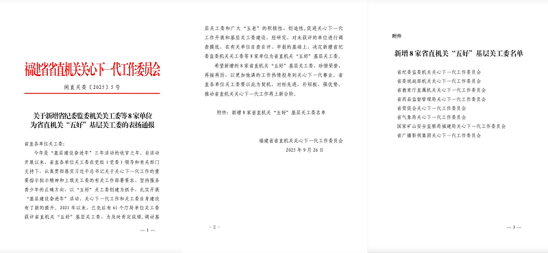 日前,省直机关关工委发文新增8家单位为省直机关“五好”基层关工委,省药监局关工委名列其中。这是我局自2018年机构改革以来首次获得此项荣誉。