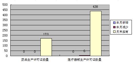 本月药品生产许可证增加0本,减少0本,期末合计170本,医疗器械生产许可证增加0本,减少6本,期末合计438本;药品批发企业增加1家,减少0家,期末合计259家;零售连锁增加0本,减少1本,期末合计105家;本月共受理药品注册71件,其中补充申请40件,再注册31件。