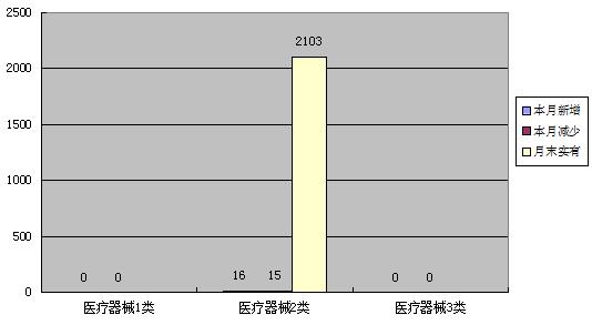 本月二类医疗器械注册证(首次注册)增加16本,本月减少15本,期末合计2103本。
