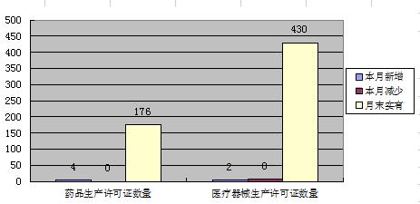 本月药品生产许可证增加4本,减少0本,期末合计176本,医疗器械生产许可证增加2本,减少8本,期末合计430本;药品批发企业增加1家,减少0家,期末合计261家;零售连锁增加0本,减少0本,期末合计105家;本月共受理药品注册80件,其中补充申请39件,再注册41件。