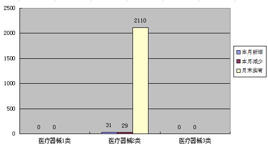 本月二类医疗器械注册证(首次注册)增加31本,本月减少29本,期末合计2110本。
